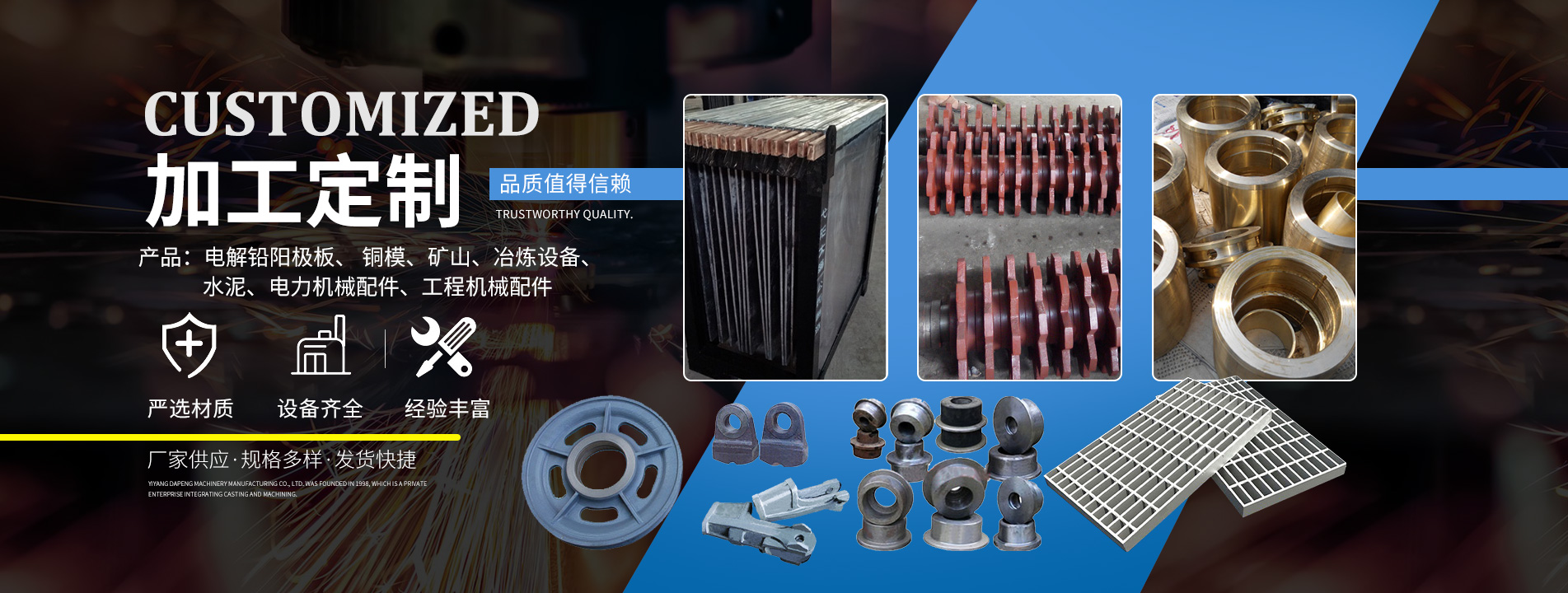 主要產品有:電解鉛陽極板、 銅模、礦山、冶煉設備、水泥、電力機械配件、工程機械配件